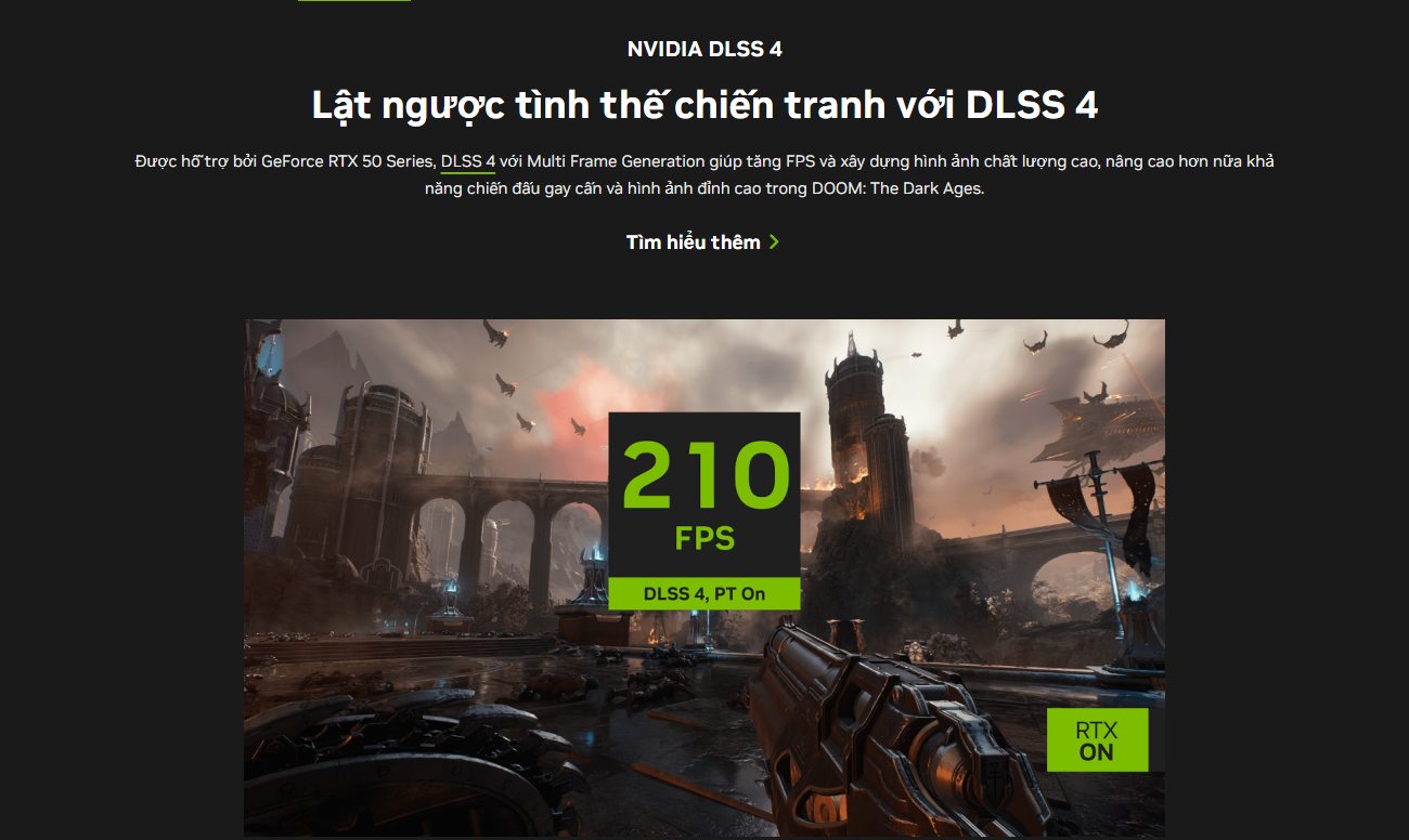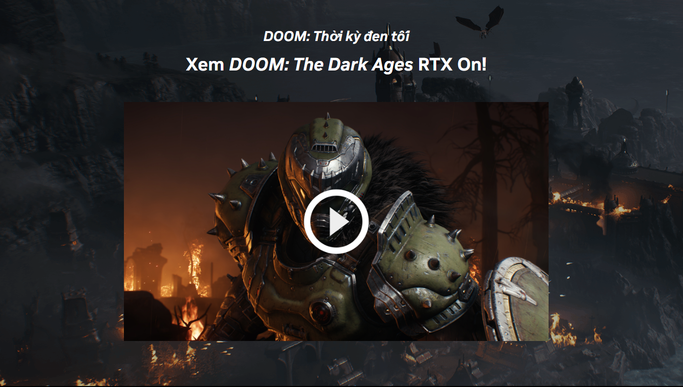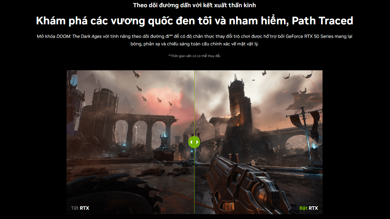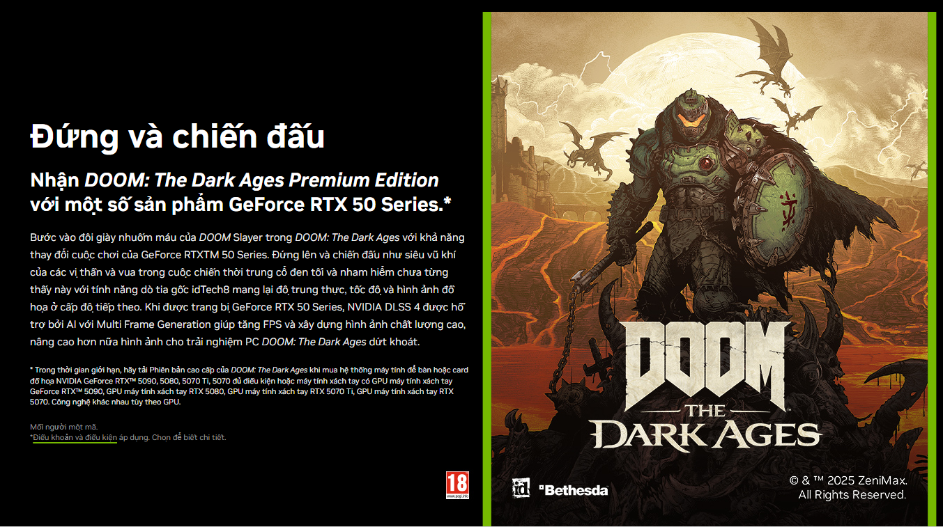 * Trong thời gian giới hạn, hãy nhận Phiên bản cao cấp của DOOM: The Dark Ages (trị giá 99.99 đô la) khi mua hệ thống máy tính để bàn hoặc card đồ họa NVIDIA GeForce RTX™ 5090, 5080, 5070 Ti, 5070 đủ điều kiện hoặc máy tính xách tay có GPU máy tính xách tay GeForce RTX™ 5090, GPU máy tính xách tay RTX 5080, GPU máy tính xách tay RTX 5070 Ti, GPU máy tính xách tay RTX 5070. Công nghệ khác nhau tùy theo GPU.