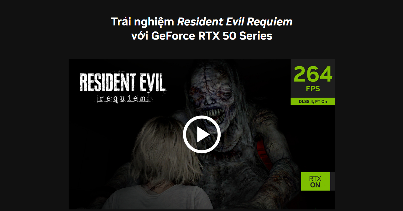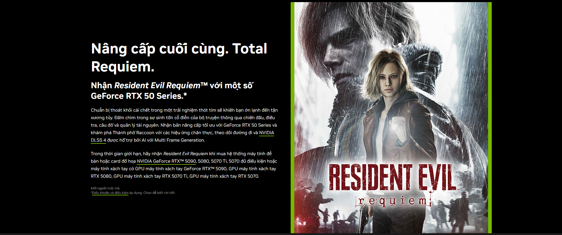 Trong thời gian giới hạn, hãy nhận Resident Evil Requiem khi mua hệ thống máy tính để bàn hoặc card đồ họa NVIDIA GeForce RTX™ 5090, 5080, 5070 Ti, 5070 đủ điều kiện hoặc máy tính xách tay có GPU máy tính xách tay GeForce RTX™ 5090, GPU máy tính xách tay RTX 5080, GPU máy tính xách tay RTX 5070 Ti, GPU máy tính xách tay RTX 5070.